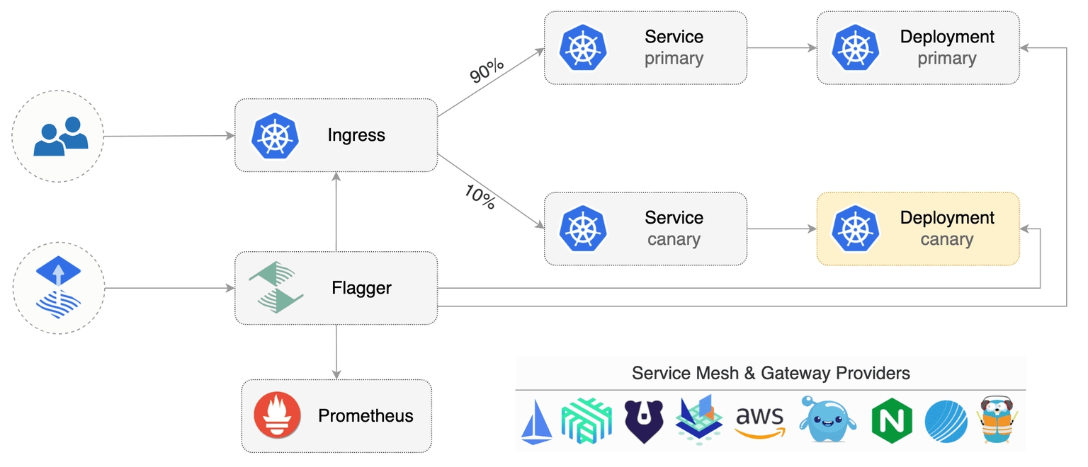 Canary: The Canary custom resource defines the deployment strategy, analysis metrics, and traffic routing rules for a specific application.MetricTemplate: This resource allows users to define custom metrics for analysis during the deployment process.AlertProvider: This resource configures alerting channels for deployment notifications.